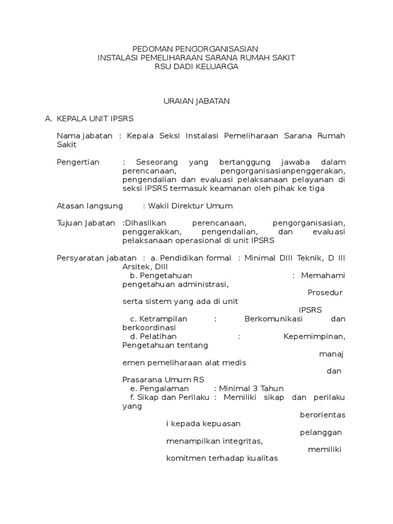 Pedoman Pengorganisasian Ipsrs Doc Jlk9mjz32545 from idoc.pub Seseorang yang bertanggung jawab dalam perencanaan pengorganisasian, pergerakan,pengendalian dan evaluasi pelaksanaan pelayanan pemeliharaan saran dan. Dewi sartika cawang iii/ 200 jakarta telp. 108 tahun 2014 pedoman pelayanan pemeliharaan 07 maret 2014 76 no. Você está na página 1 de 47. T e n t a n g. Bagian umum pasti sudah ada pedoman pengorganisasiannya. Mata kuliah managemen logistik (opk) rs dra. Instalasi pemeliharaan sarana rumah sakit.