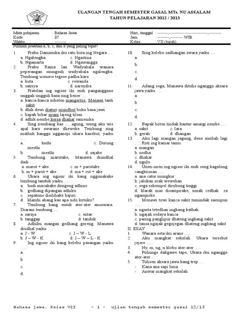 Soal Uas Bahasa Jawa Kelas 7 Semester 1 Kurikulum 2013 Peranti Guru from i.pinimg.com Check spelling or type a new query. We did not find results for: Maybe you would like to learn more about one of these? Soal b.jawa kelas 7 semester 1.