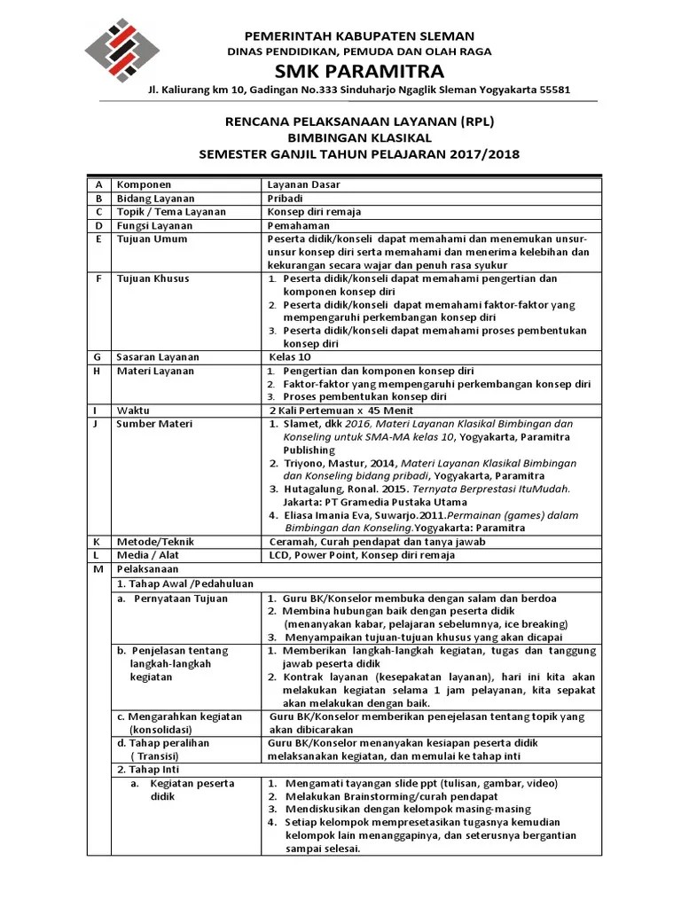 Bapak/ibu guru bk seluruh indonesia yang berbahagia, kali akan saya bagikan perangkat . Rencana pelaksanaan layanan (rpl) bk daring tahun pelajaran 2020/2021. K13 revisi 2020 (original) dilengkapi: Salah satu perangkat pembelajaran bk berupa rpl format 1 lembar/halaman ini kami dapatkan dari blog mintotulus, jadi jika anda ingin mengetahui . Rpp atau rencana program pembelajaran merupakan salah satu perangkat pembelajaran yang harus di laksanakan .